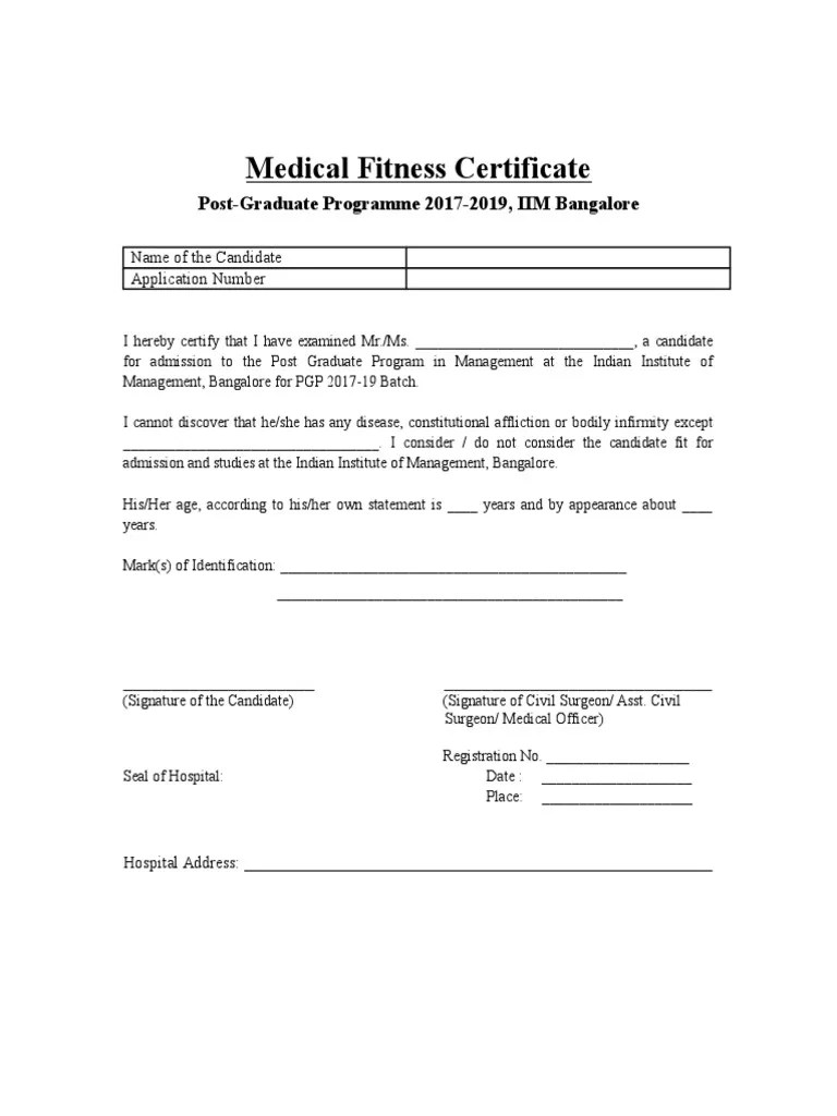 Form of medical fitness certificate (to be signed by registered medical practitioner) to be submitted at the time of admission i certify that i have carefully examined sh./smt./km. Certificate of medical fitness the certificate must be from the medical officer or any rank above it from any central/state government hospital/dispensary/medical college must be brought by the candidate at the time of interview.